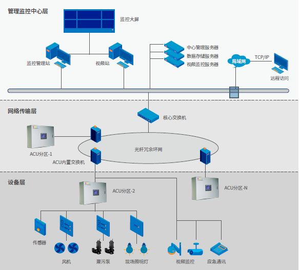 環(huán)境與設(shè)備監(jiān)控系統(tǒng)簡稱ACU(Area Control Unit),是長飛公司根據(jù)工業(yè)現(xiàn)場監(jiān)控需求自主研發(fā)的區(qū)域控制產(chǎn)品,主要負(fù)責(zé)工業(yè)現(xiàn)場特定區(qū)域內(nèi)數(shù)據(jù)采集、設(shè)備控制、組網(wǎng)傳輸、運(yùn)維管理等任務(wù),具有使用方便、性能穩(wěn)定、易于維護(hù)、模塊化、可擴(kuò)展等特點(diǎn),在市政管廊、隧道、軌道交通、工業(yè)自動(dòng)化等領(lǐng)域具有非常廣泛的應(yīng)用,ACU 采用工業(yè)級元器件,防護(hù)等級高、抗電磁干擾,具備工業(yè)以太網(wǎng)、ModBus、OPC 通訊等多種工業(yè)標(biāo)準(zhǔn)通信接口,向下可接入各種類型傳感器及工業(yè)設(shè)備,向上同ACU 管理系統(tǒng)進(jìn)行功能交互,提供了從工業(yè)設(shè)備、傳感器的接入到工業(yè)應(yīng)用服務(wù)的端到端的解決方案。長飛ACU產(chǎn)品將信號采集、自動(dòng)控制、數(shù)據(jù)交互、設(shè)備聯(lián)動(dòng)、遠(yuǎn)程聯(lián)網(wǎng)等功能集成一體,極大提升了工業(yè)現(xiàn)場智能化、數(shù)字化管理水平,降低了運(yùn)維壓力,提高了現(xiàn)場各監(jiān)控子系統(tǒng)的融合度和集成度,集中管理現(xiàn)場繁雜的監(jiān)測數(shù)據(jù)并減少通訊網(wǎng)絡(luò)的重復(fù)建設(shè),深度融合自動(dòng)化與信息化技術(shù),是國內(nèi)工業(yè)工程信息化管理必不可少的工具。